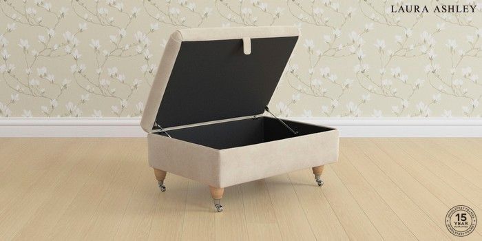 7.3.1 Buy Ambersham by Laura Ashley Storage Footstool Orla Oyster Natural Low Chrome Castor - Light Oak from the Seasons online shop Click here to use our website with more accessibility support, for example screen readers