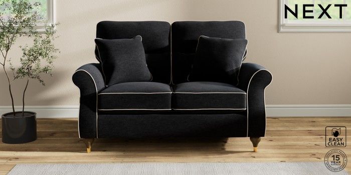 7.3.1 Buy Ashford Highback 2 Seater Small Sofa Fine Chenille with Contrast Black and Oyster Modern Turned Metal Cap - Mid from the Seasons online shop Click here to use our website with more accessibility support, for example screen readers