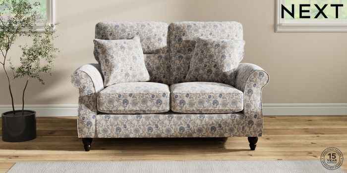 7.3.1 Buy Ashford Highback 2 Seater Small Sofa Relaxed Linen Look Print Woodblock Floral Blue Low Turned - Dark from the Seasons online shop Click here to use our website with more accessibility support, for example screen readers