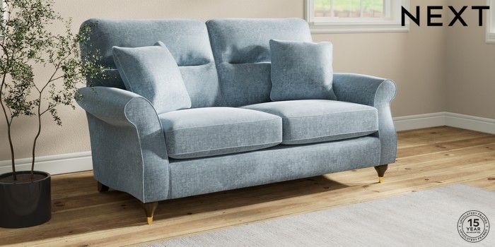 7.2.10 Buy Ashford Highback 2 Seater Sofa Plush Chenille Light Blue Modern Turned Metal Cap - Mid from the Seasons online shop Click here to use our website with more accessibility support, for example screen readers
