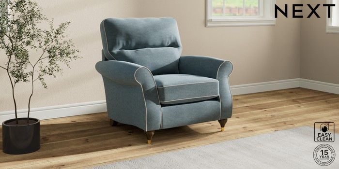 7.3.1 Buy Ashford Highback Armchair Fine Chenille with Contrast Mid Blue and Oyster Modern Turned Metal Cap - Mid from the Seasons online shop Click here to use our website with more accessibility support, for example screen readers
