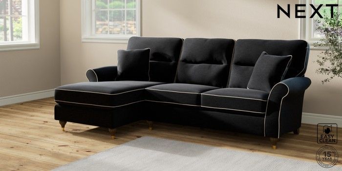 7.3.1 Buy Ashford Highback Medium Sofa Chaise - Left Hand Fine Chenille with Contrast Black and Oyster Modern Turned Metal Cap - Mid from the Seasons online shop Click here to use our website with more accessibility support, for example screen readers