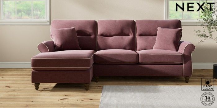 7.3.1 Buy Ashford Highback Medium Sofa Chaise - Left Hand Fine Chenille with Contrast Mid Mulberry Purple and Oyster Low Turned - Mid from the Seasons online shop Click here to use our website with more accessibility support, for example screen readers