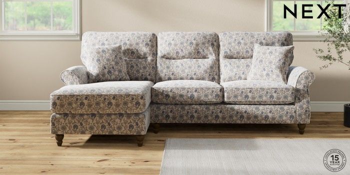 7.3.1 Buy Ashford Highback Medium Sofa Chaise - Left Hand Relaxed Linen Look Print Woodblock Floral Blue Low Turned - Mid from the Seasons online shop Click here to use our website with more accessibility support, for example screen readers