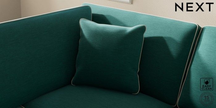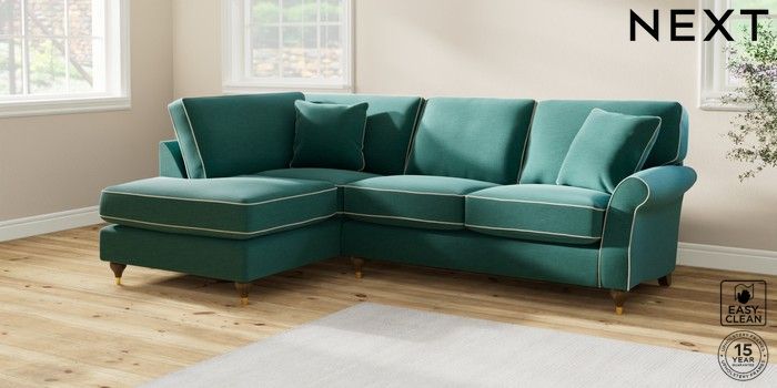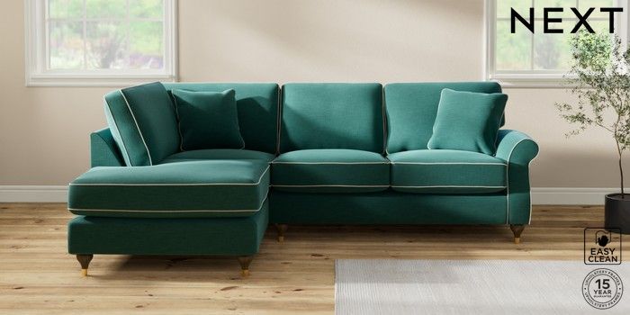 7.3.1 Buy Ashford Relaxed Sit Medium Corner Chaise - Left Hand Fine Chenille with Contrast Dark Juniper Green and Oyster Modern Turned Metal Cap - Mid from the Seasons online shop Click here to use our website with more accessibility support, for example screen readers