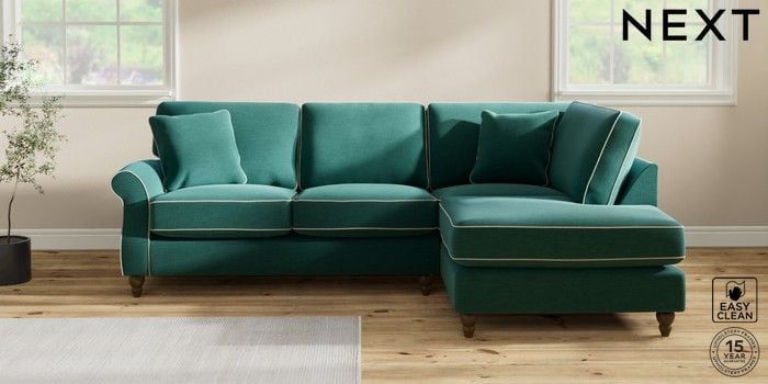 7.3.1 Buy Ashford Relaxed Sit Medium Corner Chaise - Right Hand Fine Chenille with Contrast Dark Juniper Green and Oyster Low Turned - Mid from the Seasons online shop Click here to use our website with more accessibility support, for example screen readers
