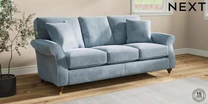 7.3.1 Buy Ashford 3 Cushion 3 Seater Sofa Plush Chenille Light Blue Modern Turned Metal Cap - Mid from the Seasons online shop Click here to use our website with more accessibility support, for example screen readers