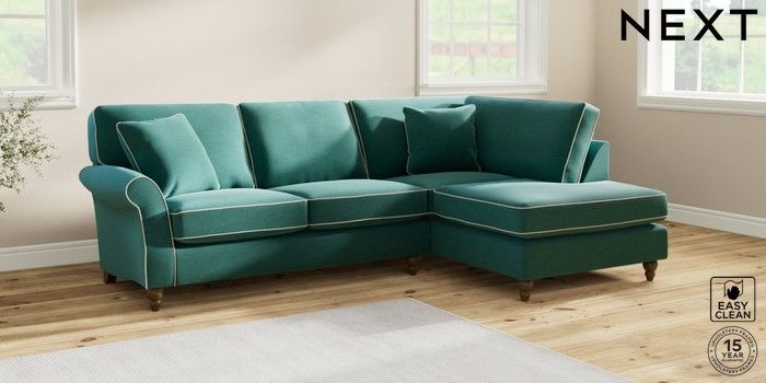7.3.1 Buy Ashford Medium Corner Chaise - Right Hand Fine Chenille with Contrast Dark Juniper Green and Oyster Low Turned - Mid from the Seasons online shop Click here to use our website with more accessibility support, for example screen readers