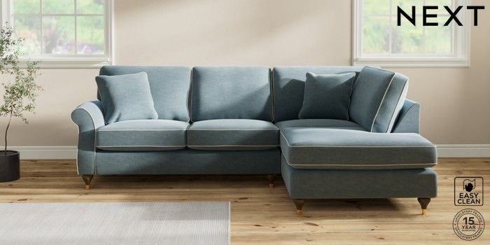 7.3.1 Buy Ashford Medium Corner Chaise - Right Hand Fine Chenille with Contrast Mid Blue and Oyster Modern Turned Metal Cap - Mid from the Seasons online shop Click here to use our website with more accessibility support, for example screen readers