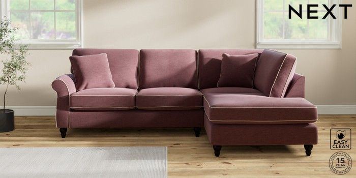 7.3.1 Buy Ashford Medium Corner Chaise - Right Hand Fine Chenille with Contrast Mid Mulberry Purple and Oyster Low Turned - Dark from the Seasons online shop Click here to use our website with more accessibility support, for example screen readers