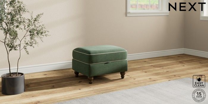 7.3.1 Buy Ashford Storage Footstool Fine Chenille with Contrast Mid Khaki Green and Oyster Low Turned - Mid from the Seasons online shop Click here to use our website with more accessibility support, for example screen readers