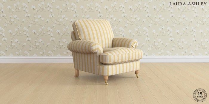 7.3.1 Buy Beaumaris by Laura Ashley Armchair Kinsham Stripe Ochre Yellow Low Brass Castor - Light Oak from the Seasons online shop