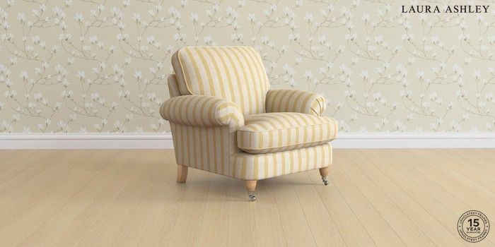 7.3.1 Buy Beaumaris by Laura Ashley Armchair Kinsham Stripe Ochre Yellow Low Chrome Castor - Light Oak from the Seasons online shop Click here to use our website with more accessibility support, for example screen readers