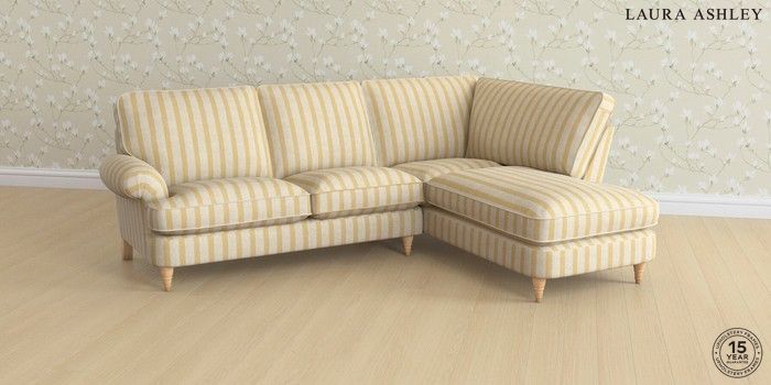 7.3.1 Buy Beaumaris by Laura Ashley Medium Sofa Chaise - Right Hand Kinsham Stripe Ochre Yellow Low Turned - Light Oak from the Seasons online shop Click here to use our website with more accessibility support, for example screen readers