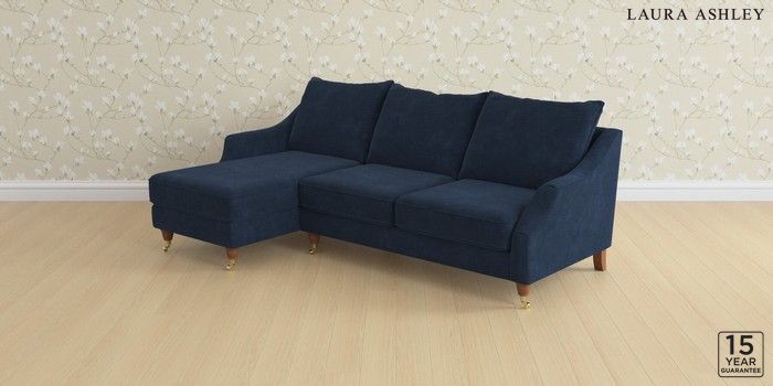7.3.1 Buy Beverley by Laura Ashley Medium Sofa Chaise - Left Hand Alwyn Velvet Midnight Navy Low Brass Castor - Teak from the Seasons online shop Click here to use our website with more accessibility support, for example screen readers