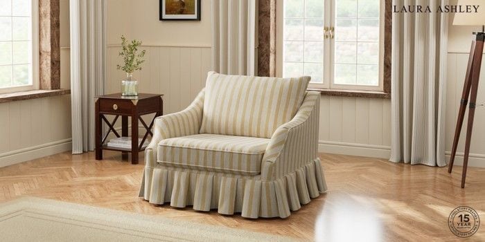 Sit back and relax in style with the elegant Laura Ashley Beverley sofa - featuring a relaxed box pleat at the base to create a beautiful modern country look. From its flared set back sofa arm design to the pillow edged back cushions smart valance to the floor, the Beverley sofa makes an excellent addition to any living space. Foam seat cushions with soft foam toppers offer comfort, support, and ease of maintenance. Pair this with the box pleat footstool to complete the look!