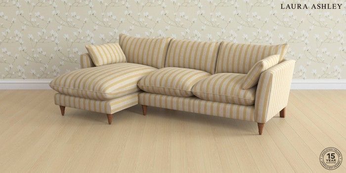 7.3.1 Buy Casterton by Laura Ashley Medium Sofa Chaise - Left Hand Kinsham Stripe Ochre Yellow Low Turned - Teak from the Seasons online shop Click here to use our website with more accessibility support, for example screen readers