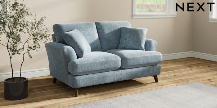 7.2.10 Buy Conway Relaxed Sit 2 Seater Small Sofa Plush Chenille Light Blue Low Retro Tapered - Mid from the Seasons online shop Click here to use our website with more accessibility support, for example screen readers