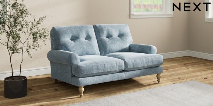 7.2.10 Buy Erin Buttoned Back Deep Relaxed Sit 2 Seater Small Sofa Plush Chenille Light Blue High Classic Turned - Light from the Seasons online shop Click here to use our website with more accessibility support, for example screen readers
