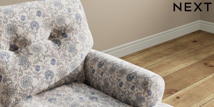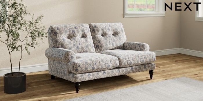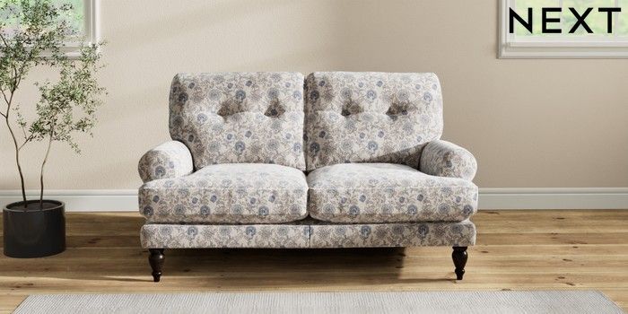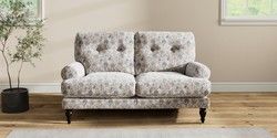 7.3.1 Buy Erin Buttoned Back Deep Relaxed Sit 2 Seater Small Sofa Relaxed Linen Look Print Woodblock Floral Blue High Classic Turned - Dark from the Seasons online shop Click here to use our website with more accessibility support, for example screen readers