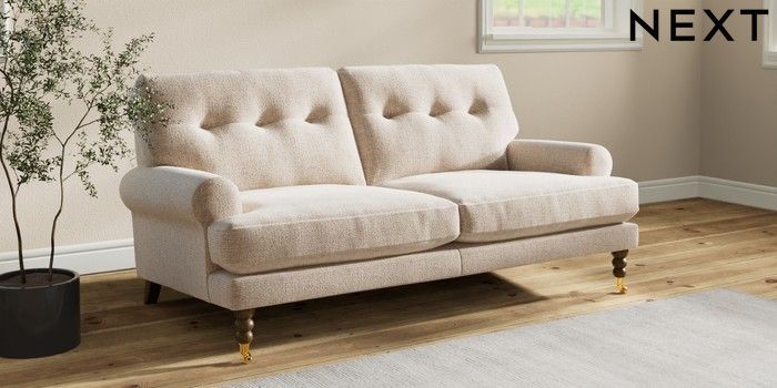 7.2.10 Buy Erin Buttoned Back Deep Relaxed Sit 3 Seater Small Sofa Multi Weave Mid Natural High Classic Turned Brass Castor - Mid from the Seasons online shop Click here to use our website with more accessibility support, for example screen readers