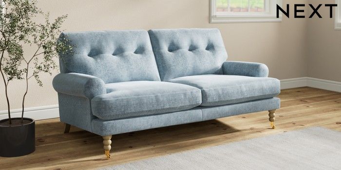7.2.10 Buy Erin Buttoned Back Deep Relaxed Sit 3 Seater Small Sofa Plush Chenille Light Blue High Classic Turned Brass Castor - Light from the Seasons online shop Click here to use our website with more accessibility support, for example screen readers