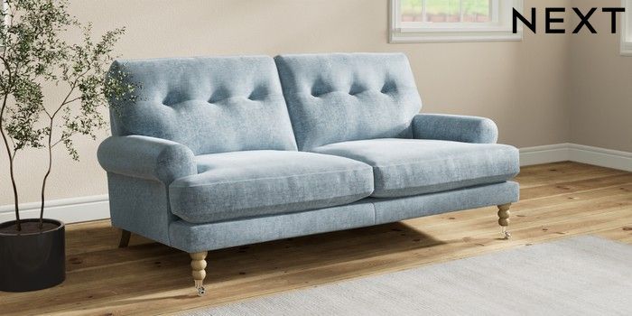 7.2.10 Buy Erin Buttoned Back Deep Relaxed Sit 3 Seater Small Sofa Plush Chenille Light Blue High Classic Turned Chrome Castor - Light from the Seasons online shop Click here to use our website with more accessibility support, for example screen readers
