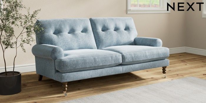 7.2.10 Buy Erin Buttoned Back Deep Relaxed Sit 3 Seater Small Sofa Plush Chenille Light Blue High Classic Turned Chrome Castor - Mid from the Seasons online shop Click here to use our website with more accessibility support, for example screen readers