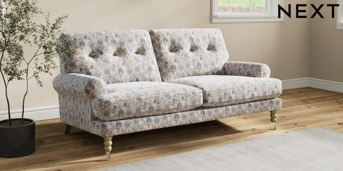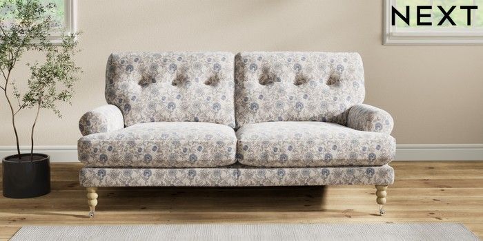 7.3.1 Buy Erin Buttoned Back Deep Relaxed Sit 3 Seater Small Sofa Relaxed Linen Look Print Woodblock Floral Blue High Classic Turned Chrome Castor - Light from the Seasons online shop Click here to use our website with more accessibility support, for example screen readers