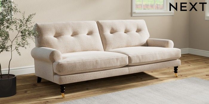 Add charm to your living space with the Erin Button Back Sofa. Its elegant scroll arms and classic button-back cushions create a timeless look. You'll love its "Relaxed Sit" cushions, specially designed for ultimate comfort. These cushions are made with clever foam and fibre, giving you a wonderfully soft, plump feel. To keep them looking their best, simply plump and turn them regularly. Plus, you can make the Erin your own by choosing from a huge range of coloured fabrics.