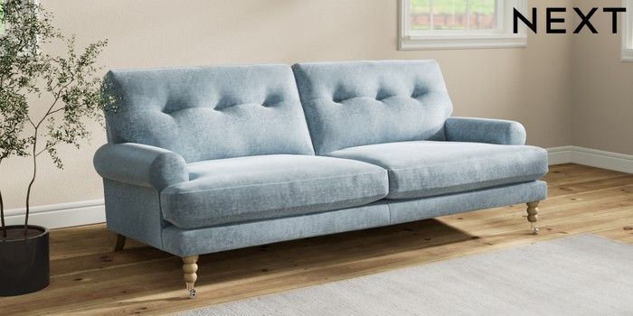 7.2.10 Buy Erin Buttoned Back Deep Relaxed Sit 3 Seater Sofa Plush Chenille Light Blue High Classic Turned Chrome Castor - Light from the Seasons online shop Click here to use our website with more accessibility support, for example screen readers