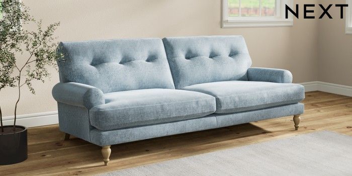 7.2.10 Buy Erin Buttoned Back Deep Relaxed Sit 3 Seater Sofa Plush Chenille Light Blue High Classic Turned - Light from the Seasons online shop Click here to use our website with more accessibility support, for example screen readers
