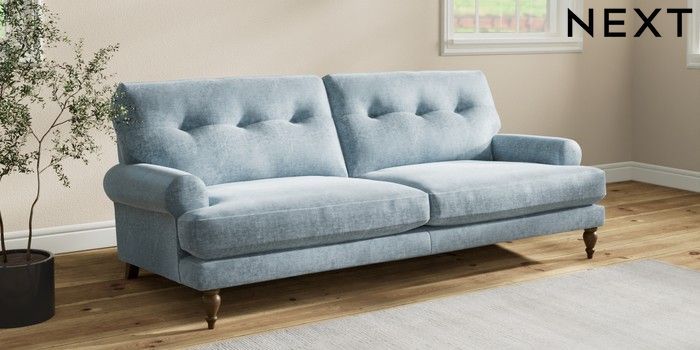 7.2.10 Buy Erin Buttoned Back Deep Relaxed Sit 3 Seater Sofa Plush Chenille Light Blue High Classic Turned - Mid from the Seasons online shop Click here to use our website with more accessibility support, for example screen readers