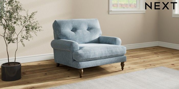 7.2.10 Buy Erin Buttoned Back Deep Relaxed Sit Armchair Plush Chenille Light Blue High Classic Turned - Mid from the Seasons online shop Click here to use our website with more accessibility support, for example screen readers