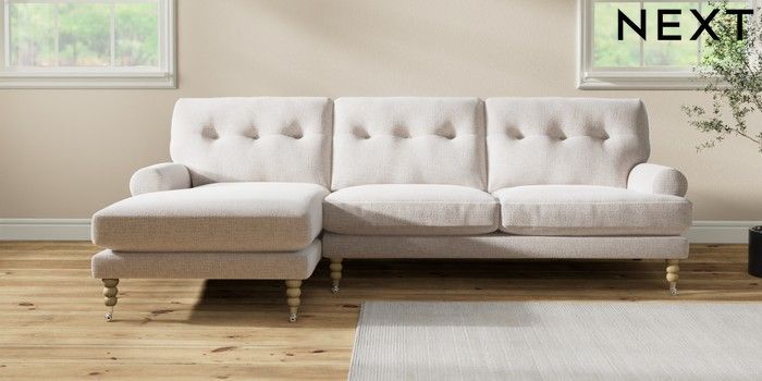 7.2.10 Buy Erin Buttoned Back Deep Relaxed Sit Medium Sofa Chaise - Left Hand Multi Weave Oyster High Classic Turned Chrome Castor - Light from the Seasons online shop Click here to use our website with more accessibility support, for example screen readers