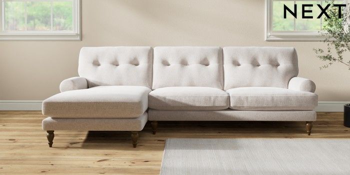 7.2.10 Buy Erin Buttoned Back Deep Relaxed Sit Medium Sofa Chaise - Left Hand Multi Weave Oyster High Classic Turned - Mid from the Seasons online shop Click here to use our website with more accessibility support, for example screen readers