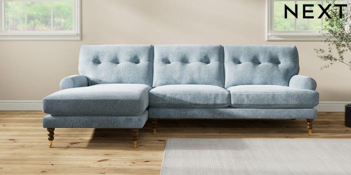 7.2.10 Buy Erin Buttoned Back Deep Relaxed Sit Medium Sofa Chaise - Left Hand Plush Chenille Light Blue High Classic Turned Brass Castor - Mid from the Seasons online shop Click here to use our website with more accessibility support, for example screen readers