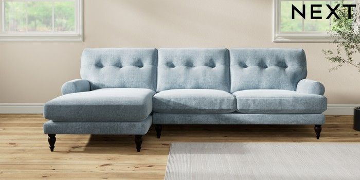 7.2.10 Buy Erin Buttoned Back Deep Relaxed Sit Medium Sofa Chaise - Left Hand Plush Chenille Light Blue High Classic Turned - Dark from the Seasons online shop Click here to use our website with more accessibility support, for example screen readers