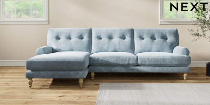 7.2.10 Buy Erin Buttoned Back Deep Relaxed Sit Medium Sofa Chaise - Left Hand Plush Chenille Light Blue High Classic Turned - Light from the Seasons online shop Click here to use our website with more accessibility support, for example screen readers
