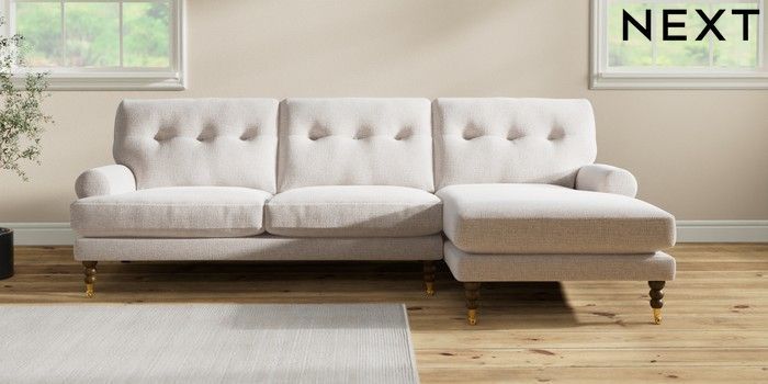 7.2.10 Buy Erin Buttoned Back Deep Relaxed Sit Medium Sofa Chaise - Right Hand Multi Weave Oyster High Classic Turned Brass Castor - Mid from the Seasons online shop Click here to use our website with more accessibility support, for example screen readers