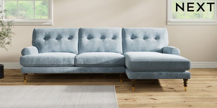7.2.10 Buy Erin Buttoned Back Deep Relaxed Sit Medium Sofa Chaise - Right Hand Plush Chenille Light Blue High Classic Turned Brass Castor - Mid from the Seasons online shop Click here to use our website with more accessibility support, for example screen readers