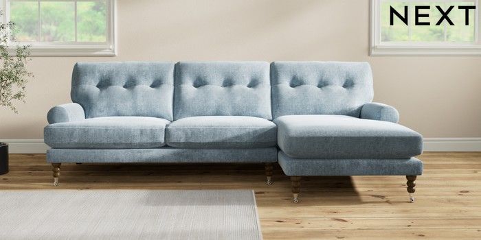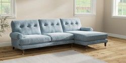 7.2.10 Buy Erin Buttoned Back Deep Relaxed Sit Medium Sofa Chaise - Right Hand Plush Chenille Light Blue High Classic Turned Chrome Castor - Mid from the Seasons online shop Click here to use our website with more accessibility support, for example screen readers