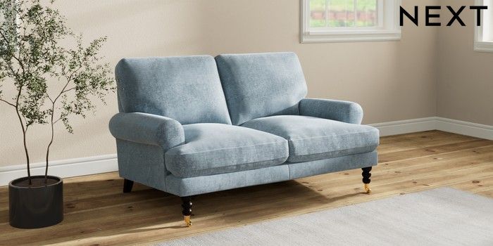 7.3.1 Buy Erin Deep Relaxed Sit 2 Seater Small Sofa Plush Chenille Light Blue High Classic Turned Brass Castor - Dark from the Seasons online shop Click here to use our website with more accessibility support, for example screen readers