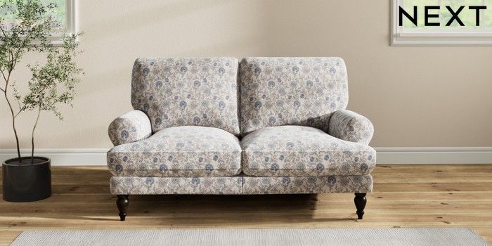 7.3.1 Buy Erin Deep Relaxed Sit 2 Seater Small Sofa Relaxed Linen Look Print Woodblock Floral Blue High Classic Turned - Dark from the Seasons online shop