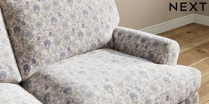 7.3.1 Buy Erin Deep Relaxed Sit 3 Seater Small Sofa Relaxed Linen Look Print Woodblock Floral Blue High Classic Turned Chrome Castor - Mid from the Seasons online shop