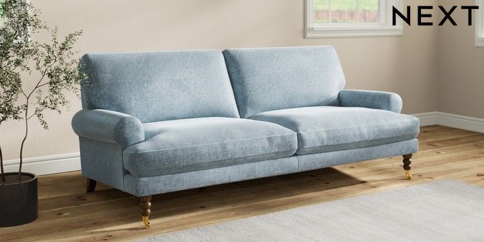 7.2.10 Buy Erin Deep Relaxed Sit 3 Seater Sofa Plush Chenille Light Blue High Classic Turned Brass Castor - Mid from the Seasons online shop Click here to use our website with more accessibility support, for example screen readers