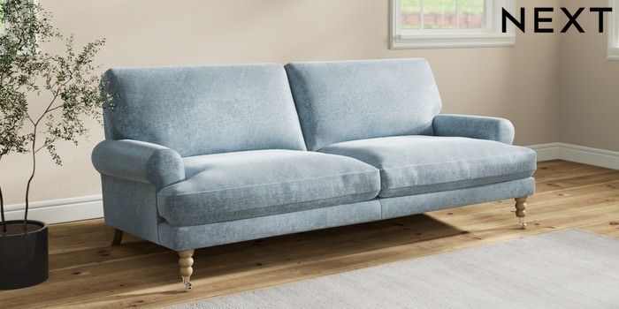 7.2.10 Buy Erin Deep Relaxed Sit 3 Seater Sofa Plush Chenille Light Blue High Classic Turned Chrome Castor - Light from the Seasons online shop Click here to use our website with more accessibility support, for example screen readers