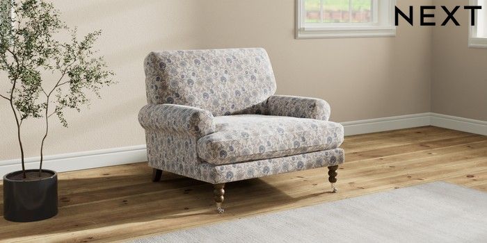 7.3.1 Buy Erin Deep Relaxed Sit Armchair Relaxed Linen Look Print Woodblock Floral Blue High Classic Turned Chrome Castor - Mid from the Seasons online shop