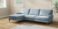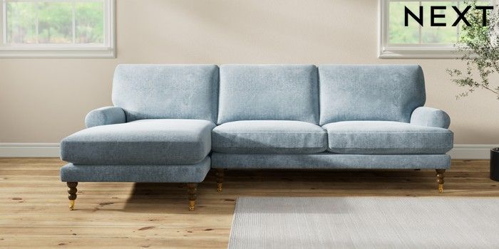 7.2.10 Buy Erin Deep Relaxed Sit Medium Sofa Chaise - Left Hand Plush Chenille Light Blue High Classic Turned Brass Castor - Mid from the Seasons online shop Click here to use our website with more accessibility support, for example screen readers