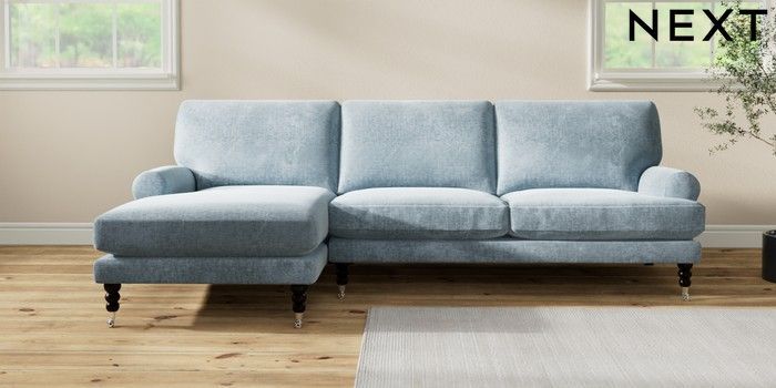 7.2.10 Buy Erin Deep Relaxed Sit Medium Sofa Chaise - Left Hand Plush Chenille Light Blue High Classic Turned Chrome Castor - Dark from the Seasons online shop Click here to use our website with more accessibility support, for example screen readers